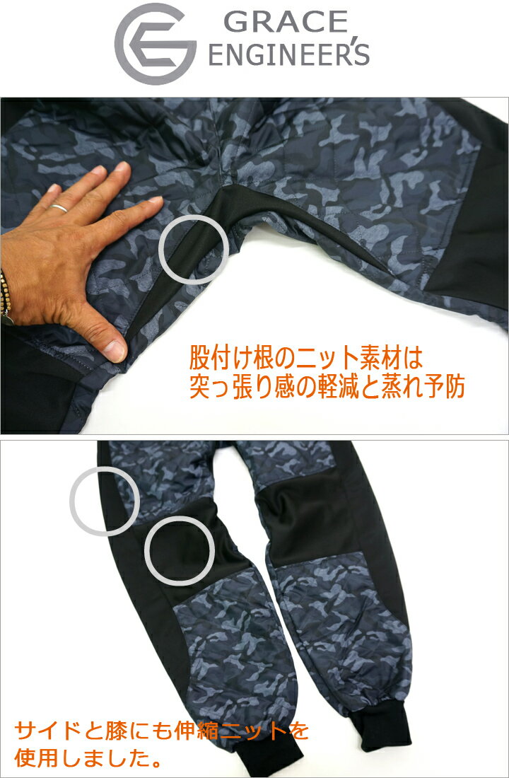 【GE-2049インナーパンツのサイズスペック】 S(参考身長161−166ウエスト74-94ヒップ98股上26股下72)M(参考身長166−171ウエスト77-98ヒップ102股上27股下74)L(参考身長171−176ウエスト80-102ヒップ106股上28股下76)LL(参考身長176−181ウエスト83-106ヒップ10股上29股下78)3L(参考身長181−186ウエスト86-110ヒップ114股上30股下80)4L(参考身長186−191ウエスト89-114ヒップ118股上31股下82)5L(参考身長191−196ウエスト92-118ヒップ122股上32股下84) ■素材:ポリエステル100% ■中綿:ポリエステル100%(※サーモライト) ■裏地:ポリエステル100% Colorブラック/カモフラ ■サイズ S/M/L/LL/3L/4L/5L(3L.4L.5L寸は価格アップ) ■商品説明 皆さまに待ちに待った待望の商品!なかなか有りそうで無かったワーク用キルティングインナーズボン(セットアップ用)(中綿サーモライト)が あのグレースエンジニアより新発売されました! 特徴はまずサイド・ひざのニット素材、これは運動機能の向上性をUP!通気性にも一役かってます。