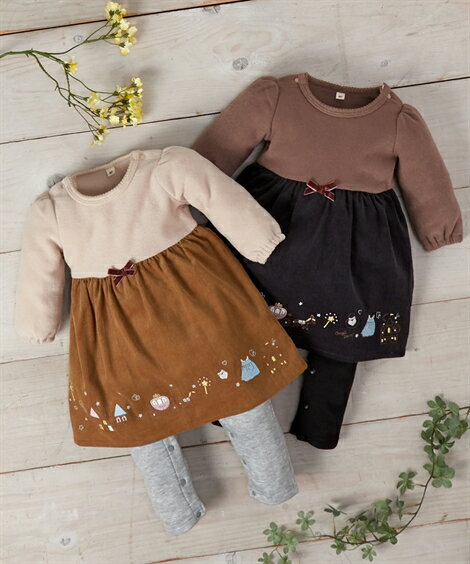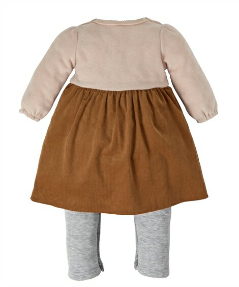 ナチュラルガーリーな雰囲気で、赤ちゃんではなく、ちょっぴりお姉さん見えしそう!本体は裏起毛素材、スカート部分はコーデュロイであったかいです。